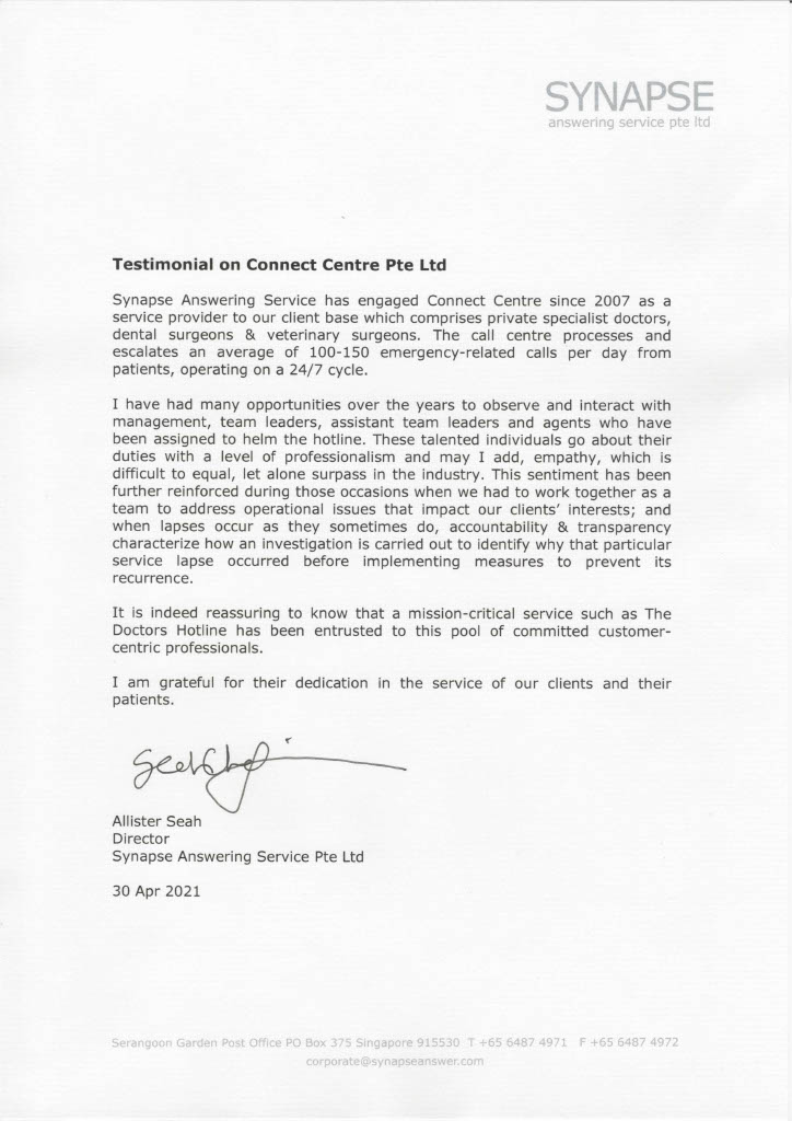 The National Gallery Singapore (NGS) would like to commend Connect Centre Pte Ltd (CC) for their support in providing contact centre services over the past nine years, since 2016.